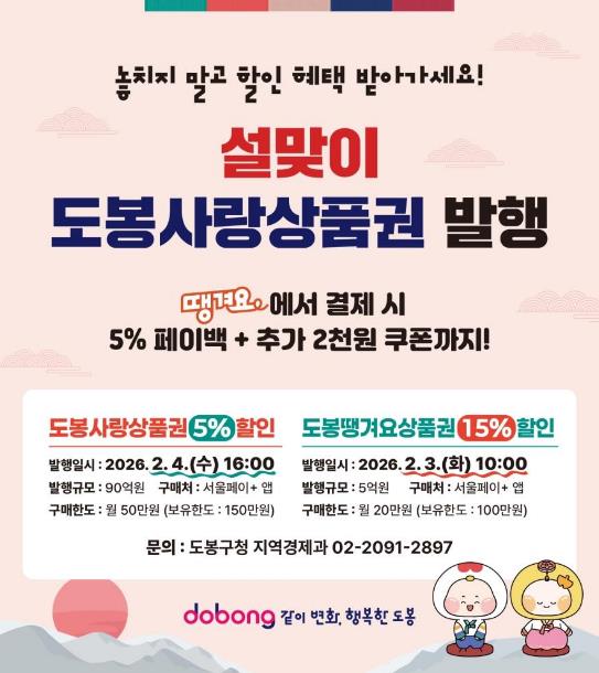 [메이저뉴스]서울 도봉구가 민족 대명절 설을 맞아 90억 원 규모의 도봉사랑상품권과 5억 원 규모의 도봉땡겨요상품권을 발행한다.
