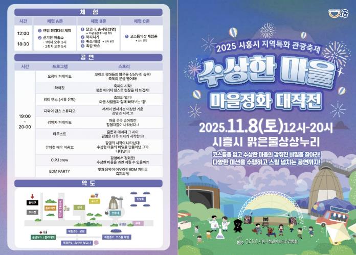 [메이저뉴스]시흥시는 2025년 시흥시 지역특화 관광축제 지원사업 선정 축제인 ‘수상한 마을 마을정화대작전’을 오는 11월 8일 정왕동 맑은물상상누리 일원에서 개최한다. 이번 축제는 시흥시 청년예술연합회가 주관한다.