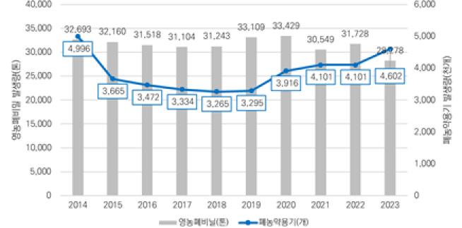 2023년 기준 경기도 영농폐기물 발생량은 영농 폐비닐이 약 3만 톤(93%), 폐농약 용기가 약 460만 개(94%)로 나타났다.