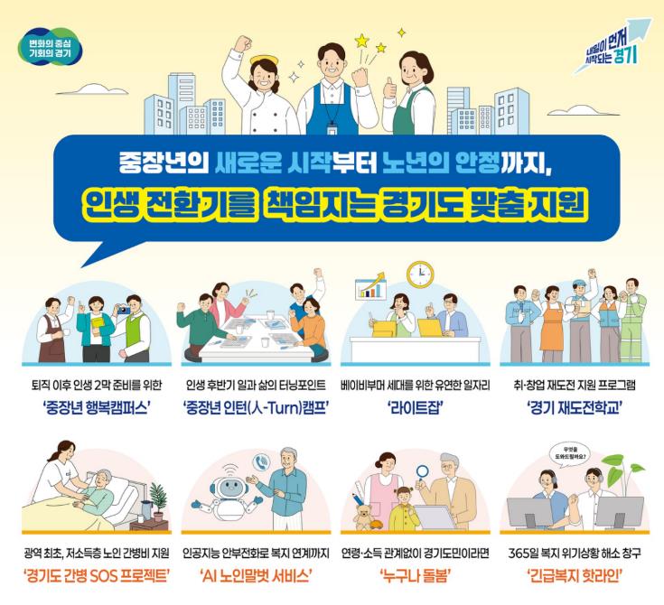 [메이저뉴스]퇴직 이후의 삶을 어떻게 꾸려야 할지 고민하는 중장년부터, 간병과 돌봄 문제로 어려움을 겪는 어르신과 가족까지. 경기도는 올해도 도민이 인생의 전환기에서 새로운 기회를 얻고 안정적으로 생활할 수 있도록 맞춤형 정책을 계속해 나간다.