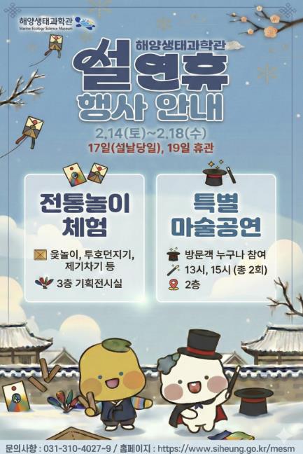 [메이저뉴스]시흥시는 설 명절을 맞아 시민과 방문객이 뜻깊은 시간을 보낼 수 있도록 오는 2월 14일부터 18일까지 해양생태과학관에서 설 연휴 특별 행사를 운영한다.