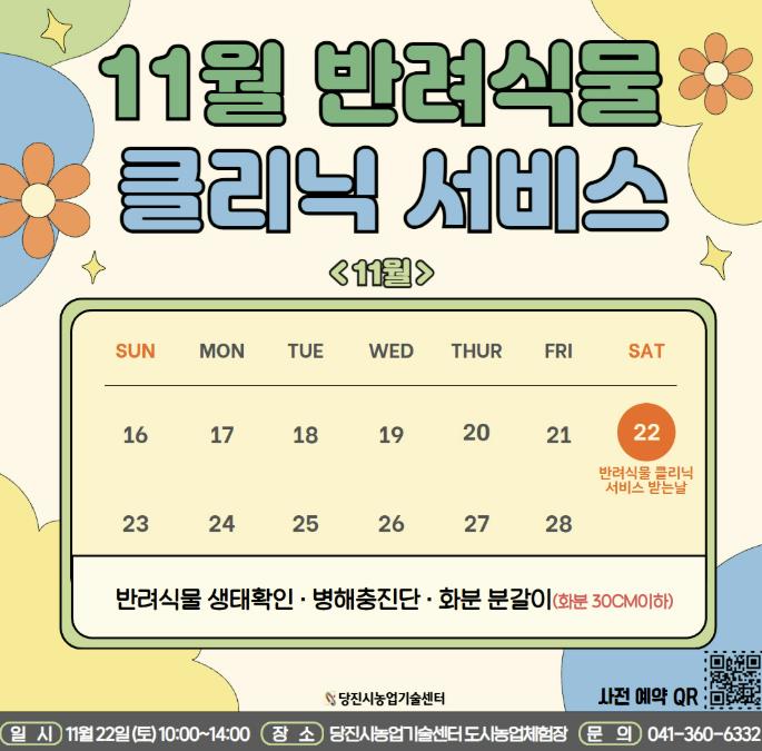 [메이저뉴스]당진시농업기술센터는 시민들의 반려식물 관리 역량을 높이고, 도시농업의 저변 확대를 위해 오는 22일 오전 10시부터 오후 2시까지 농업기술센터 도시농업체험장에서‘반려식물 클리닉 서비스’를 운영한다고 18일 밝혔다.