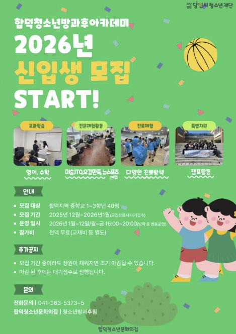 [메이저뉴스](재)당진시청소년재단 합덕청소년문화의집 방과후아카데미는 2026학년도 신입생을 모집한다. 합덕청소년방과후아카데미는 연간 230일 운영되는 국가 정책사업으로, 방과 후 돌봄이 필요한 청소년에게 안정적인 학습·체험·생활 지원을 제공하고 있다.