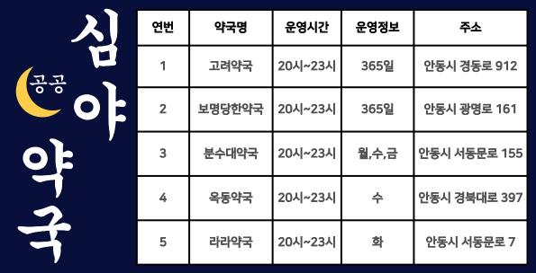 안동시 관계자는 “공공심야약국 운영을 통해 의약품 구입 불편을 해소하고 오남용을 예방하고자 한다”며 “심야 시간에도 안심하고 이용할 수 있는 신뢰받는 의약 환경 조성에 최선을 다하겠다”고 전했다.
