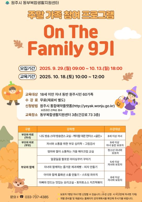 [메이저뉴스]원주시동부복합생활지원센터는 오는 10월 18일, 주말 가족 프로그램 ‘온 더 패밀리(On The Family)’ 9기 과정을 운영한다.