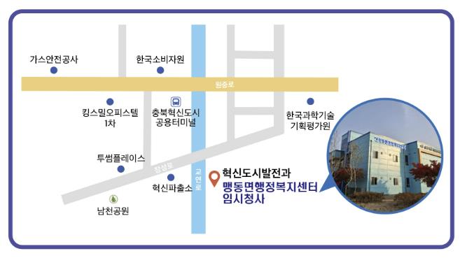 임시청사는 충북혁신도시에 위치한 충청북도 혁신도시발전과 1층(맹동면 장성로 128)에 마련됐으며, 운영 기간은 12월 1일부터 청사 준공 시까지이다.