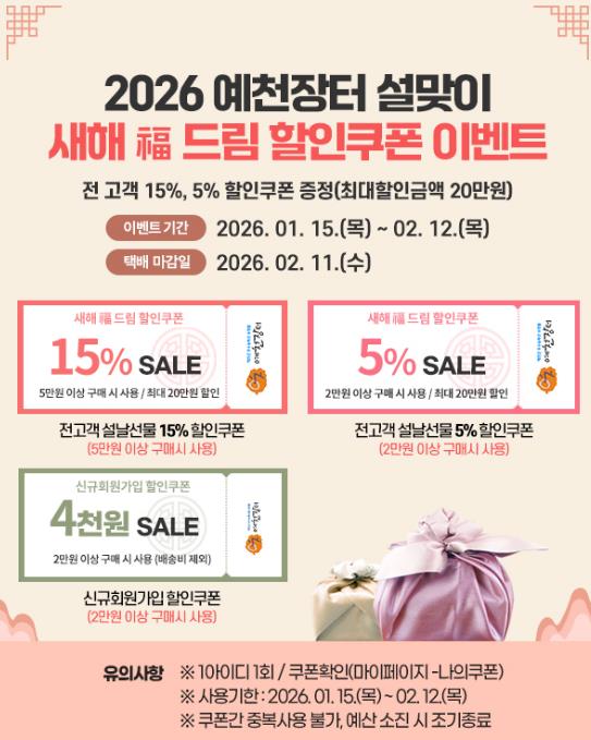 이번 특별 할인 기간 동안 전 회원을 대상으로 “5%, 15% 할인쿠폰(최대 할인 금액 20만 원)”을 지급하고, 품목별·업체별 추가 할인을 더해 최대 30%의 할인율로 예천군의 우수한 농‧특산물을 만나볼 수 있다.