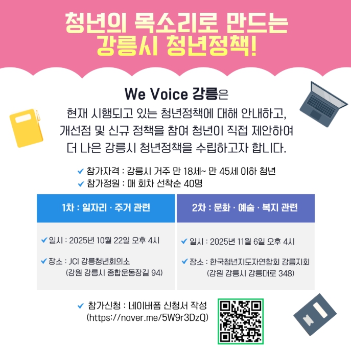 참여대상은 강릉시에 거주하는 만 18세~45세 이하 청년으로, 관심 있는 청년은 QR코드를 통해 오는 21일까지 신청할 수 있다.