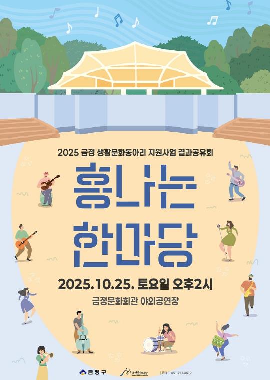 [메이저뉴스]부산시 금정구 금정문화재단은 금정생활문화동아리 지원사업 '흥나는 금정'의 결과 공유회 “흥나는 한마당”프로그램을 오는 10월 25일 오후 2시부터 오후 4시까지 금정문화회관 야외공연장에서 개최한다고 밝혔다.