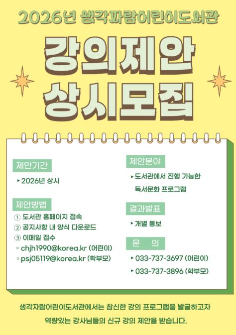 [메이저뉴스]원주시 생각자람어린이도서관은 시민들에게 다양한 독서문화 프로그램을 제공하기 위해 강의 제안을 상시 모집한다.