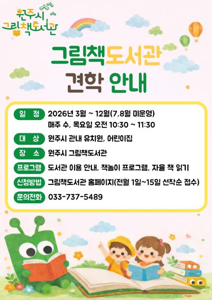 [메이저뉴스]원주시 그림책도서관은 오는 3월부터 12월까지 관내 유치원과 어린이집을 대상으로 어린이 견학 프로그램을 운영한다.