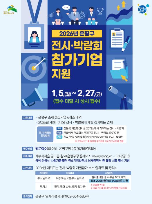 [메이저뉴스]서울 은평구는 내달 27일까지 ‘2026년 국내외 전시‧박람회 개별 참가 지원사업’에 참여할 기업을 모집한다고 밝혔다.