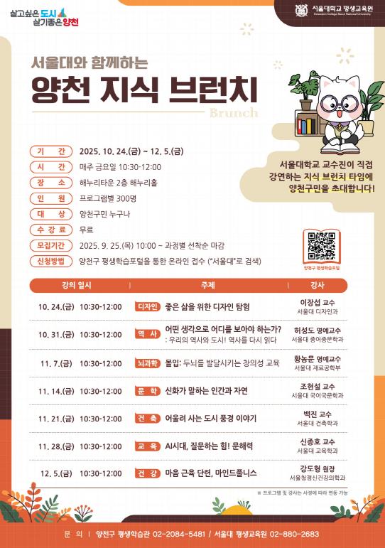 [메이저뉴스]양천구는 구민의 인문학적 소양을 넓히고 평생학습 문화를 확산하기 위해 서울대 교수진이 직접 출강하는 고품격 교양 프로그램 ‘양천 지식 브런치’를 오는 10월 말부터 7주간 해누리타운 해누리홀에서 운영한다고 10일 밝혔다.