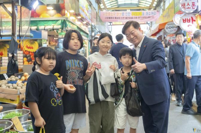 | ▲ 박승원 광명시장이 지난 9월 30일 광명새마을시장을 찾은 아이들과 기념사진을 촬영하고 있다. |