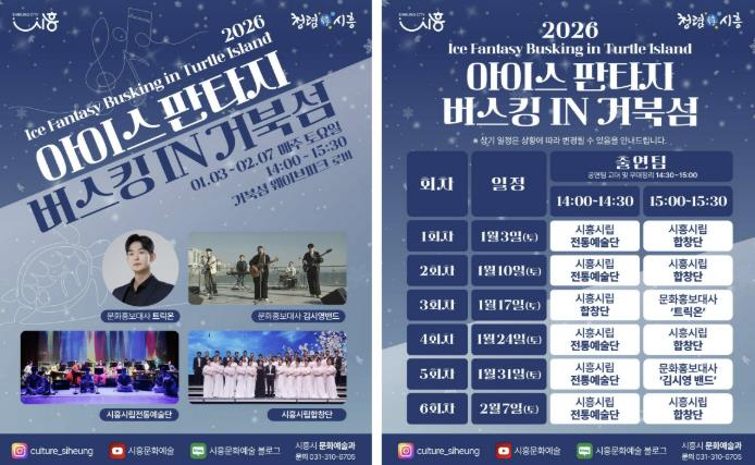 [메이저뉴스]시흥시는 지난 연말에 진행된 ‘2025 시흥 사운드 오브 윈터’의 열기를 잇는 후속 문화예술 프로그램으로, 겨울철 거북섬을 찾는 시민과 관광객에게 풍성한 즐길 거리를 제공하고자 ‘2026 아이스 판타지 버스킹 인 거북섬’을 운영한다.