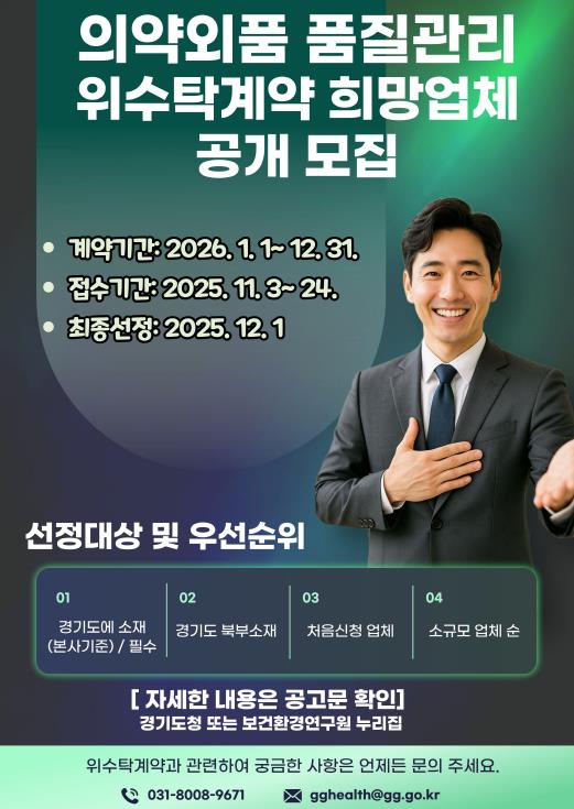 [메이저뉴스]경기도보건환경연구원은 오는 24일까지 ‘2026년 의약외품 품질검사 위·수탁계약’ 참여를 희망하는 제조·수입업체를 모집한다.