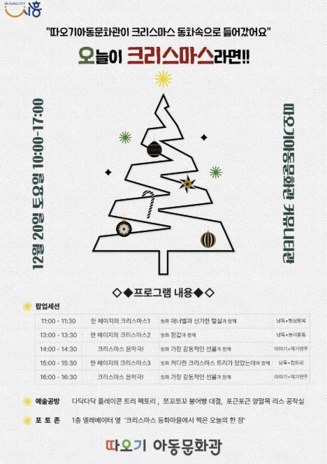 [메이저뉴스]시흥시 따오기아동문화관이 오는 12월 20일 크리스마스 문화행사 ‘오늘이 크리스마스라면’을 연다. 반짝이는 트리, 서늘한 겨울 공기, 책장을 넘기는 소리가 한데 어우러지며 문화관은 잠시 ‘이야기가 살아 움직이는 공간’으로 변한다.
