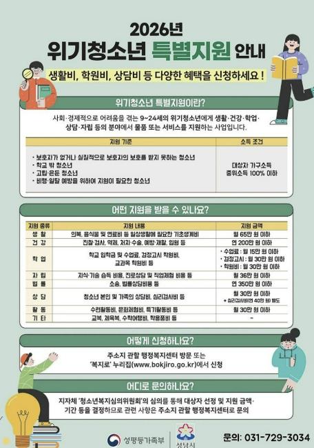 [메이저뉴스]성남시는 위기 청소년의 생활, 학업 등을 돕기 위한 특별지원 사업을 시행한다고 3일 밝혔다.