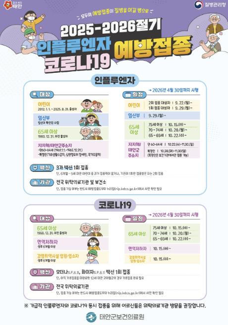 아울러, 만 60~64세 군민을 비롯해 기초생활수급자, 심한 정도의 장애인, 국가유공자(이상 만 14~59세) 등 태안군 자체 예방접종 대상자의 경우 태안군에 주소지를 두고 있어야 한다.