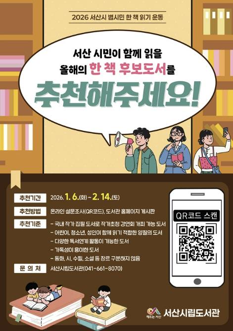 [메이저뉴스]충남 서산시는 오는 1월 6일부터 2월 14일까지 2026년 범시민 한 책 읽기 운동의 후보 도서를 추천받는다고 밝혔다.