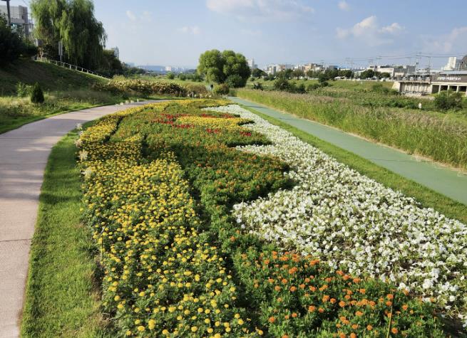 흥덕대교 일원 꽃정원은 9월 초 계절꽃 8종 8만본을 식재했으며, 9월 말 시에서 직영 운영하는 꽃묘장에서 생산한 국화 약 5천본을 심었다.