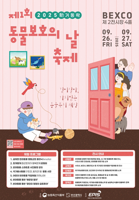 [메이저뉴스]부산시는 농림축산식품부와 공동으로 오는 9월 26일부터 27일까지 이틀간 벡스코 제2전시장에서 '제1회 동물보호의 날 축제'를 개최한다고 밝혔다.