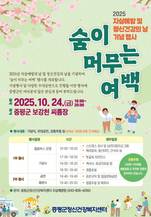 [메이저뉴스]충북 증평군정신건강복지센터가 오는 24일 오후 4시 보강천 씨름장 특설무대에서 자살예방 및 정신건강의 날 행사를 개최한다.