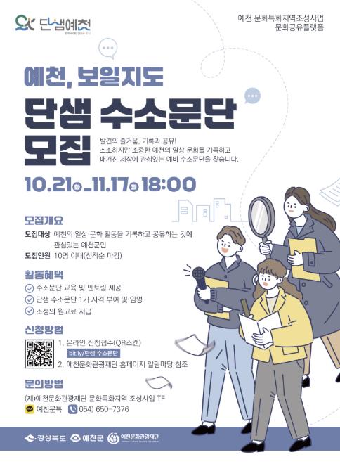[메이저뉴스]예천군과 (재)예천문화관광재단은 예천 문화특화지역 조성사업의 일환으로 추진하는 ‘예천, 보일지도’의 ‘단샘 수소문단’ 프로그램 참여자를 11월 17일까지 모집한다.