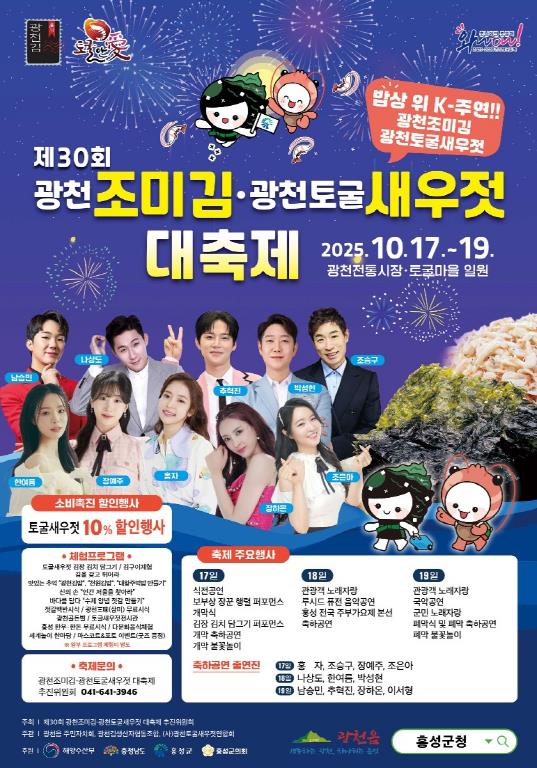 정희채 광천읍장은 “지역 공동체가 함께 준비한 이번 축제는 광천만의 독특한 정체성을 보여줄 것이다”라며, “깊어가는 가을, 맛과 멋, 그리고 온 가족이 즐길 수 있는 특별한 추억을 광천에서 만들어 가시길 바란다”고 전했다.