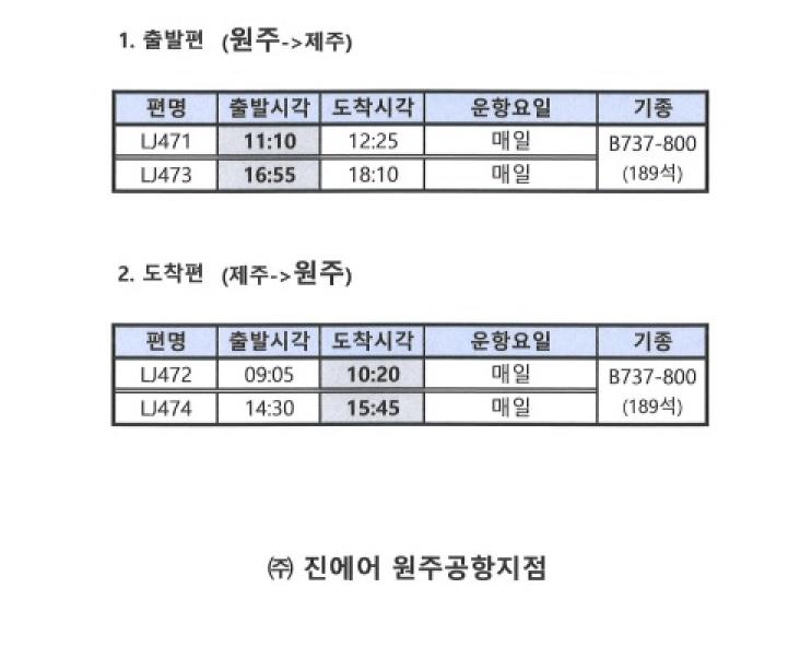 또한 제주공항에서 원주로 돌아오는 항공편은 종전 오전 9시 5분·오후 3시 20분에서 오전 9시 5분·오후 2시 30분으로 조정된다.