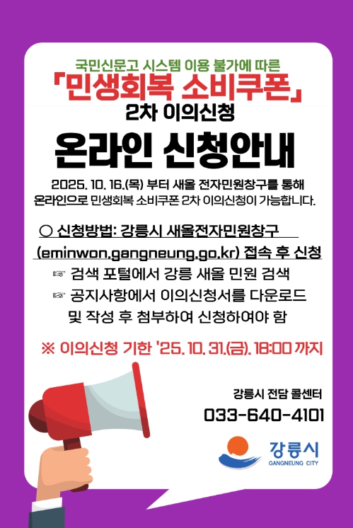 [메이저뉴스] 강릉시는 국가정보시스템 장애로 인해 국민신문고 시스템 이용이 일시적으로 불가함에 따라, 온라인 민원 접수 불편을 해소하기 위해 새올 전자민원(상담민원) 창구를 통해 ‘민생회복 소비쿠폰 2차 이의신청’을 재개한다.