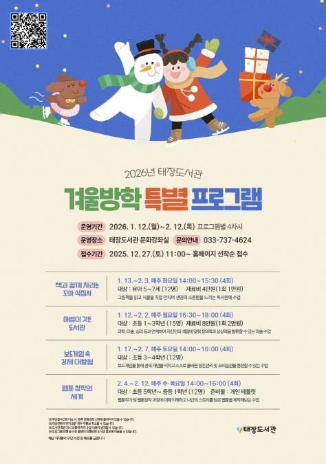 [메이저뉴스]원주시 태장도서관은 겨울방학을 맞아 1월 12일부터 2월 12일까지 겨울방학 특별 프로그램을 운영한다.