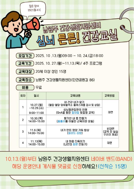 [메이저뉴스]남원주건강생활지원센터는 심뇌혈관질환의 이해·예방과 건강관리를 돕기 위해 10월 27일부터 11월 13일까지 ‘심뇌 튼튼! 건강교실’을 운영한다.
