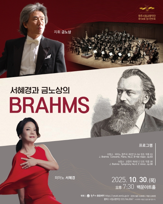 박혜순 원주시 문화예술과장은 “원주시립교향악단의 연주가 금노상 지휘자의 섬세하고 힘 있는 지휘와 서혜경 피아니스트의 스타일로 재해석된 연주를 만나 브람스의 음악적 깊이를 심도 있게 전달할 것”이라고 말했다.