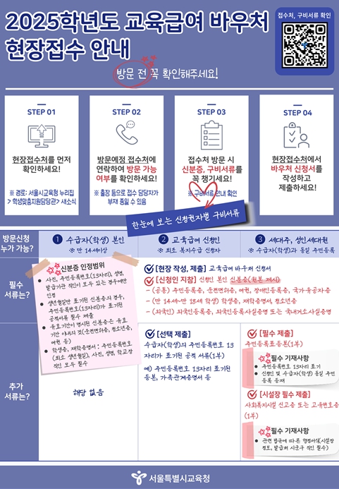[메이저뉴스]서울특별시교육청은 2025년 12월 2일부터 12월 12일까지, 2025학년도 교육급여 바우처 미신청자 중 온라인 신청이 어려운 대상을 위해 한시적 현장 접수를 운영한다고 밝혔다.