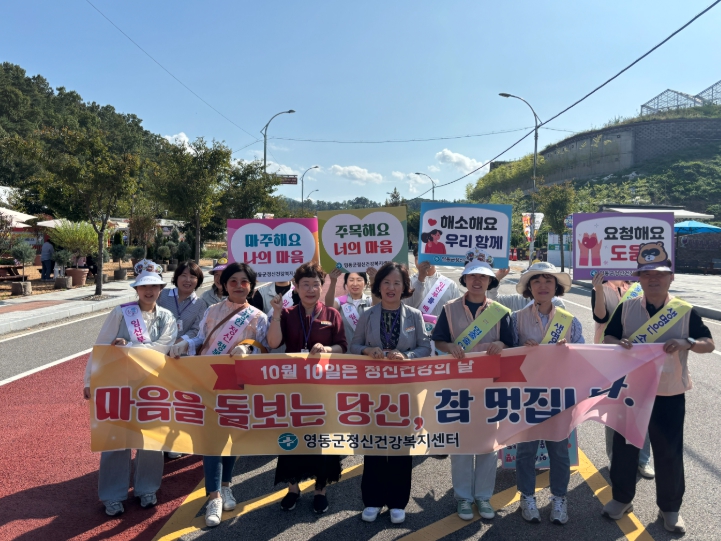 이번 캠페인은 10월 10일 정신건강의 날을 맞이하여 자살 예방에 대한 사회적 관심과 공감대를 확산하기 위해 마련됐으며, 영동군정신건강복지센터 직원 등 10여 명이 참여했다.