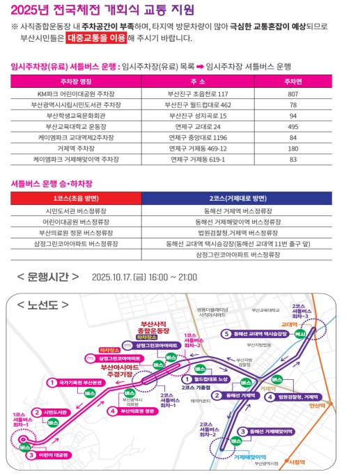 셔틀버스는 임시주차장(유료) 7곳*에서 개회식 장소인 아시아드주경기장까지 2개 노선으로 운행된다.