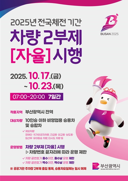 황현철 시 교통혁신국장은 “이번 전국체전 기간 부산을 찾는 선수단과 방문객들에게 원활한 교통 서비스를 제공하는 것은 물론, 선진 교통도시 부산의 이미지를 널리 알리겠다”라며, “차량 2부제 참여, 대중교통 이용, 신호 준수·배려 운전 등 선진 교통문화 실천에 시민 여러분의 적극적인 참여와 관심을 부탁드린다”라고 전했다.