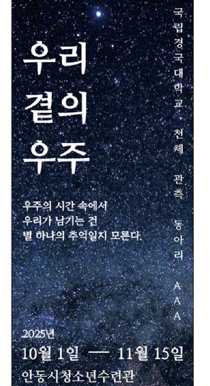 이번 전시회는 청소년수련관과 국립경국대학교 천체 관측 동아리가 함께 준비한 것으로, ‘우리 곁의 우주’를 주제로 청소년들이 직접 촬영한 천체 사진 작품 10점이 선보인다. 특히 청소년들이 동아리 활동을 통해 얻은 성과를 시민과 나누는 자리라는 점에서 의미가 크며, 지역사회가 청소년들의 창의성을 가까이에서 확인할 수 있는 기회가 될 것으로 기대된다.