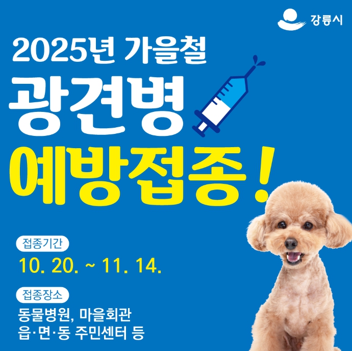 [메이저뉴스]강릉시는 인수공통전염병으로 알려진 광견병으로부터 시민과 반려동물을 안전하게 보호하기 위해 오는 10월 20일부터 11월 14일까지 4주간 가을철 광견병 예방접종을 실시한다.