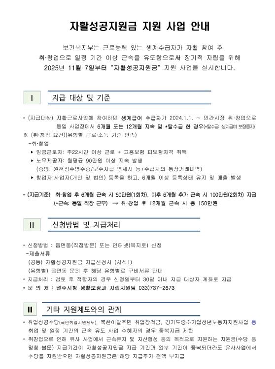 [메이저뉴스]원주시는 오는 26일까지 2025년 ‘자활성공지원금’ 신청을 접수한다.
