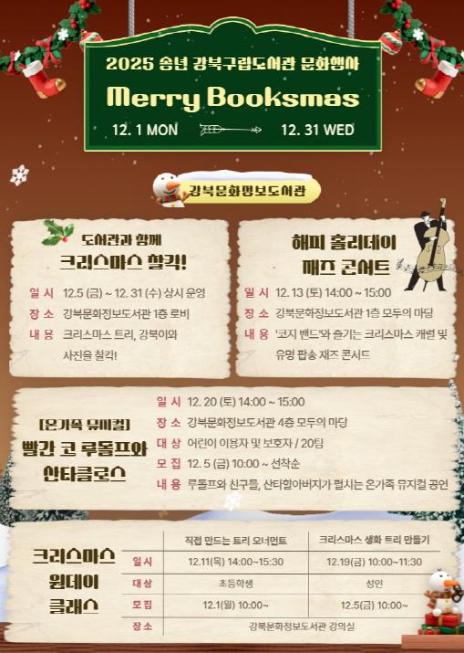 [메이저뉴스]서울 강북구는 강북구립도서관이 송년의 달과 크리스마스 시즌을 맞아 ‘2025년 강북구립도서관 송년의 달 기념 행사 Merry Booksmas(메리 북스마스)’를 운영한다고 밝혔다.