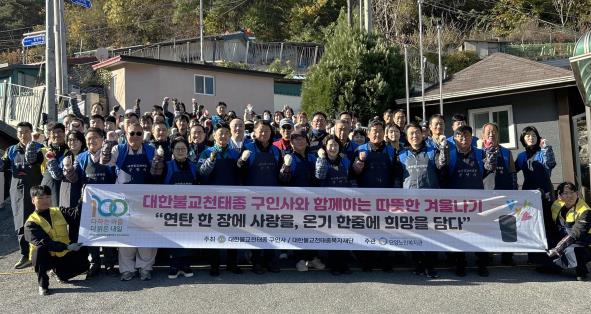 [메이저뉴스]대한불교천태종 구인사 총무원과 사회복지법인 대한불교천태종복지재단이 주최하고, 단양노인복지관이 주관한 ‘따뜻한 겨울나기’ '연탄 한 장에 사랑을, 온기 한 줌에 희망을 담다' 연탄 나눔 행사가 11월 12일 충북 단양군 단성면 일대에서 진행됐다.