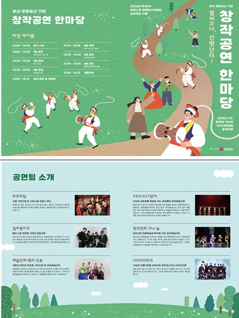 공연에는 부산을 기반으로 활동하는 6개 팀이 참여해, 무형유산의 과장(科場) 변형, 무형유산 간 융합, 전통요소에 현대적 예술을 접목한 10~15분 이내의 창작 작품을 선보인다.