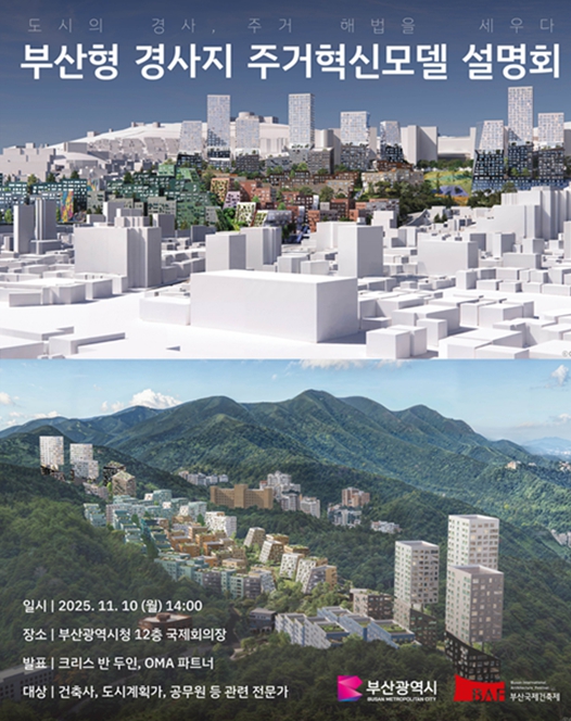 시는 이번 설명회를 통해 건축·도시 전문가와 함께 '경사지라는 도시의 제약을 혁신의 기회로 바꾸는 부산형 주거모델' 비전을 제시하고, 향후 도시정비사업과 주거정책 전반에 새로운 방향성을 수립해 나갈 계획이다.