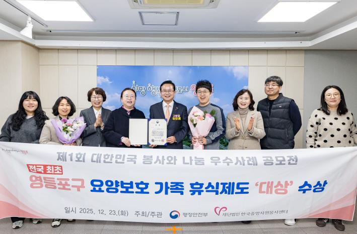 [메이저뉴스]영등포구가 행정안전부 주최 2025년 제1회 대한민국 봉사와 나눔 우수사례 공모전에서 ‘요양보호가족 휴식제도’로 ‘행정안전부 장관상(대상)’을 수상했다고 밝혔다. 공공부문 자치구 가운데 유일한 수상으로, 지역 기반 돌봄 정책의 우수성을 전국적으로 인정받았다.