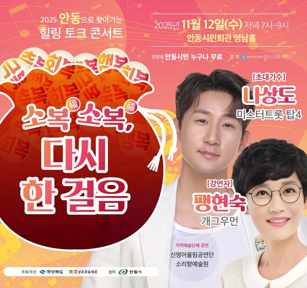 [메이저뉴스]경상북도와 경북문화재단 주최․주관하고 안동시가 협력하는 ‘찾아가는 힐링 토크콘서트-소복소복 다시 한 걸음’이 11월 12일 오후 7시, 안동시민회관 영남홀에서 개최된다.