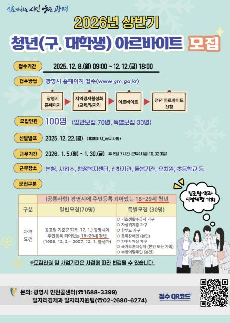 [메이저뉴스]광명시는 오는 8일부터 12일까지 ‘2026년 상반기 청년 아르바이트’ 참여자 100명을 모집한다.