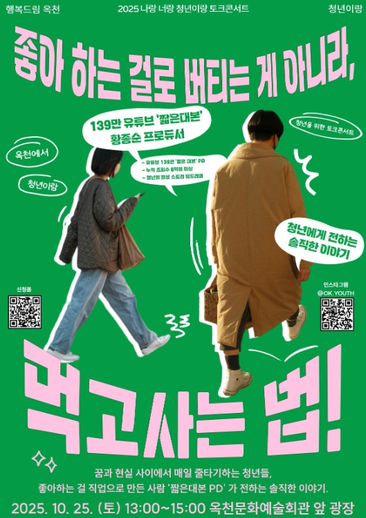 [메이저뉴스]옥천군은 오는 10월 25일 오후 1시, 문화예술회관 앞 광장에서 청년의 관심사와 목소리를 반영한 '2025년 청년 토크콘서트' 1회차 ‘청년이 청년에게’를 개최한다.