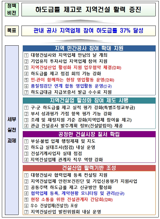 아울러 건전한 시장질서 확립을 위해 불법하도급, 하도급대금 지급보증서 미이행, 직접시공 위반 등 불공정 행위에 대한 점검과 행정제재도 강화한다.